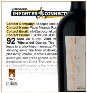 La revista norteamericana Wine Enthusiast ha incluido en su newsletter de junio los resultados de la cata Importer Connection de Ribera del Duero para bodegas sin representación en EE.UU. y los resultados para nuestros vinos han sido magníficos: 92 puntos para NEPTIS Expresión 2009 y 90 puntos para ARCO de CURIEL crianza 2009.